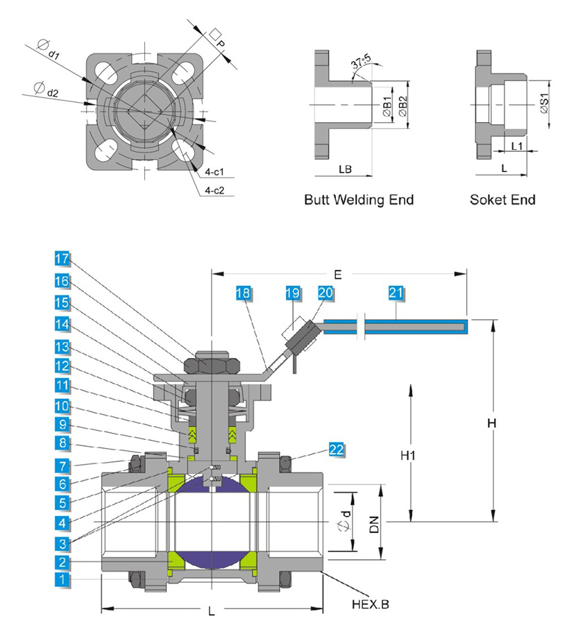 3PC高平台内螺纹球阀 1000WOG F101